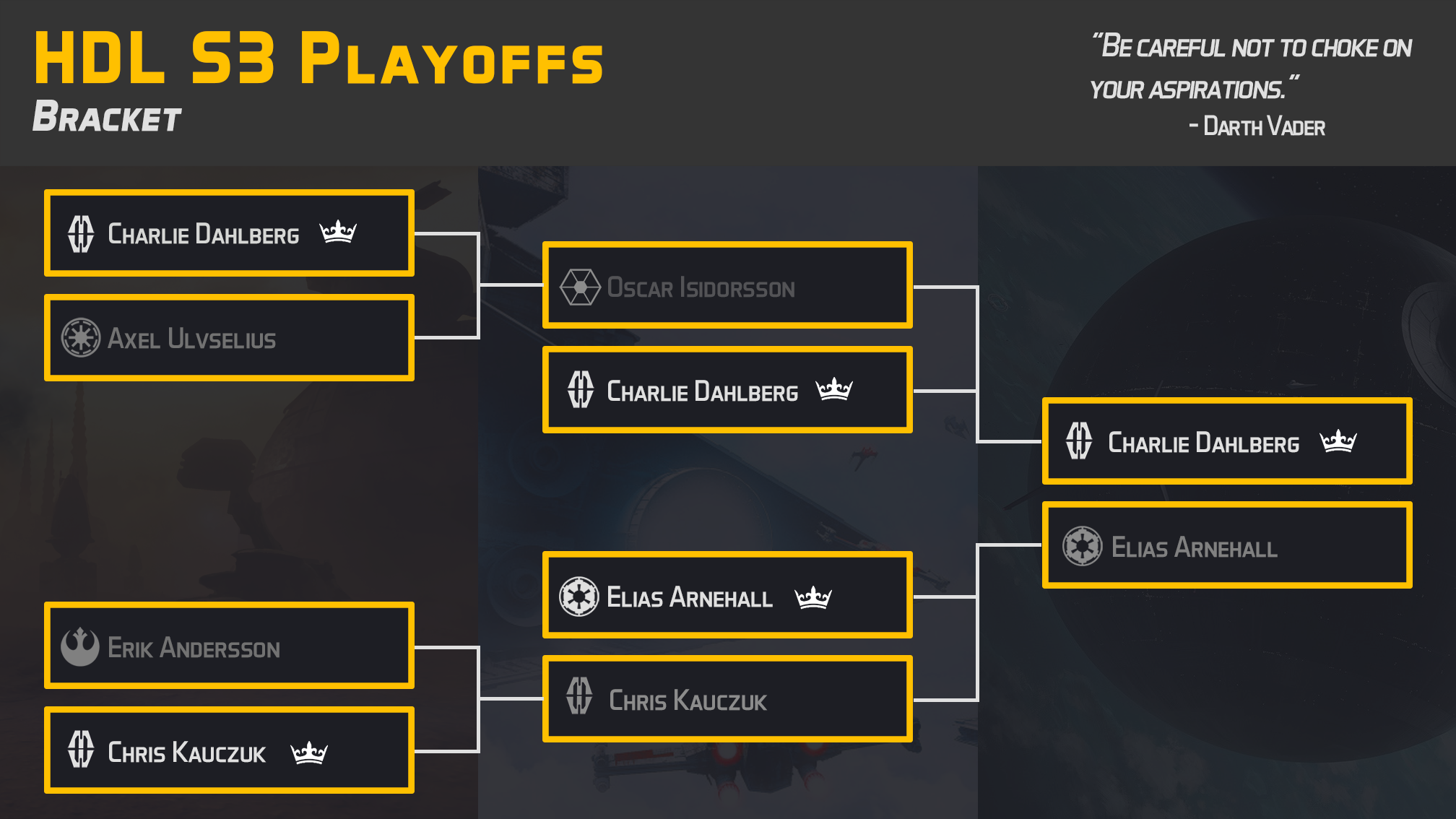 Därefter väntade slutspel. Elias, med sin Iden doubly bounty lista, och Oscar med sin double AAT lista, kvalificerade direkt till semifinal tack vare deras höga MOV. I kvartsfinal möttes Axel (GAR, Cody) och Charlie (Black suns, Cad Bane) i ena bracket-änden och i andra möttes Chris (Black suns, Maul) och Erik (Bright Tree Village).